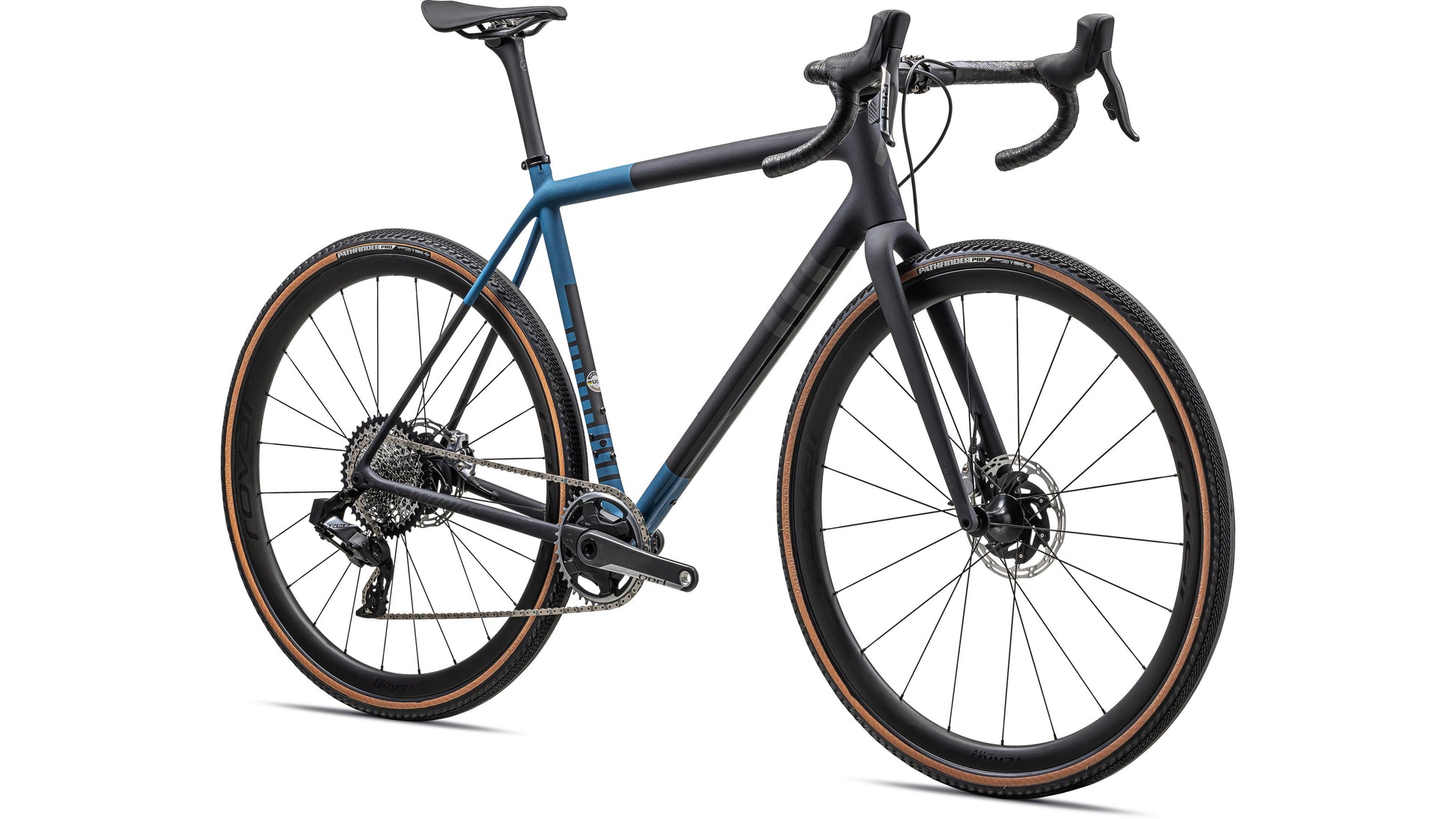 This S-Works Crux comes spec'd with SRAM's pinnacle RED eTap AXS hydraulic disc groupset, lightweight and durable Roval Terra CLX Disc wheels, and 2Bliss Ready, 700x38mm Pathfinder Pro tires that hookup over nasty terrain.