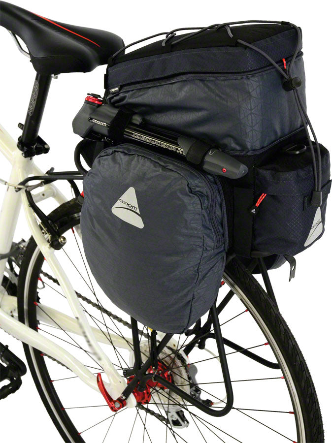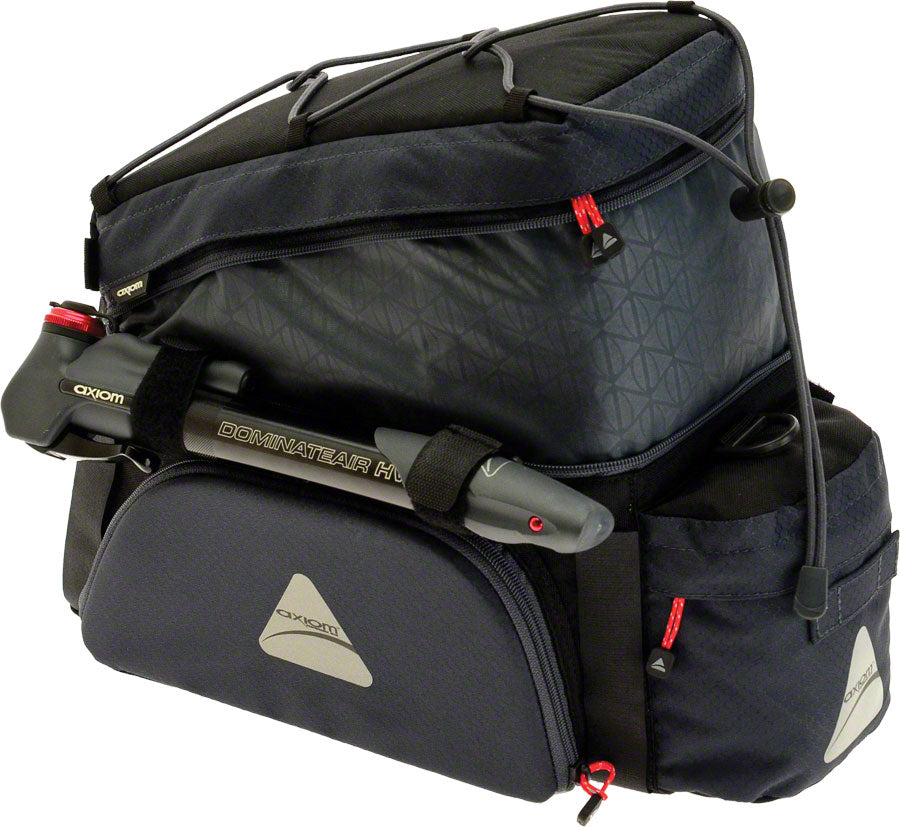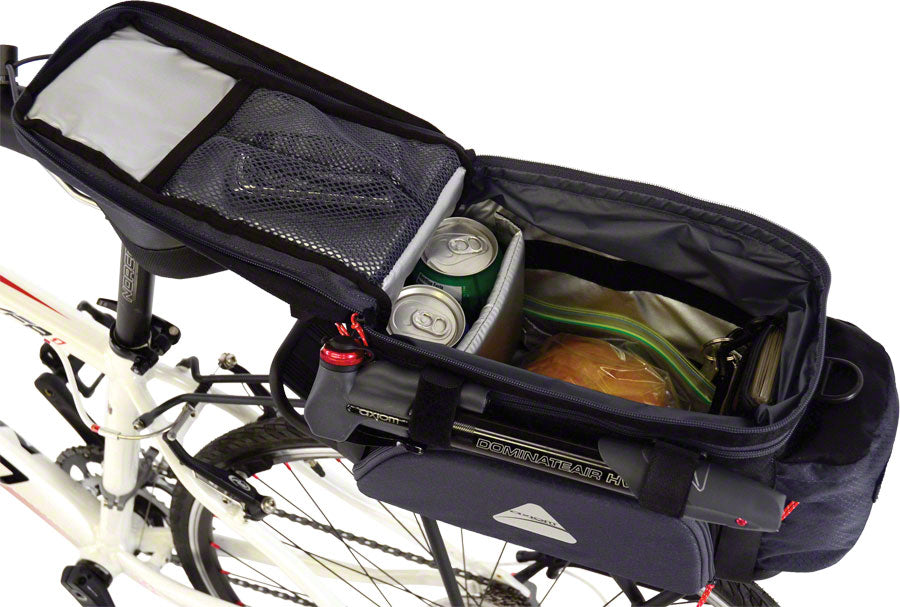 An expandable insulated trunk bag with multiple organizer pockets, top-load bungee and mini pump mount.- An expandable insulated trunk bag with multiple organizer pockets, top-load bungee and mini pump mount.