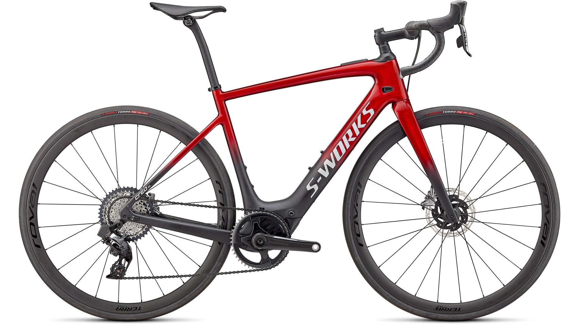Like all of our S-Works bikes, the S-Works Turbo Creo SL is our pinnacle build. The FACT 11r chassis and Future Shock 2.0 with a hydraulic damper is dressed with a 1x build that includes SRAM Red AXS eTap and a 10-44t cassette for an incredible gear range. It rolls on Roval Terra CLX Disc carbon wheels and 30mm S-Works Turbo tires. And to finish off the build, we've included our S-Works Carbon Hover bars, an S-Works Future Stem, and a Body Geometry S-Works Power saddle. We're throwing in a range extender too, because you're never going to want to stop riding this bike.