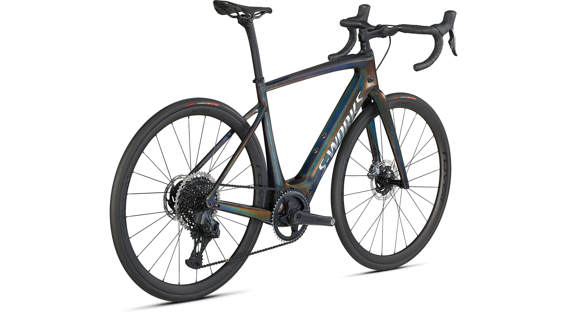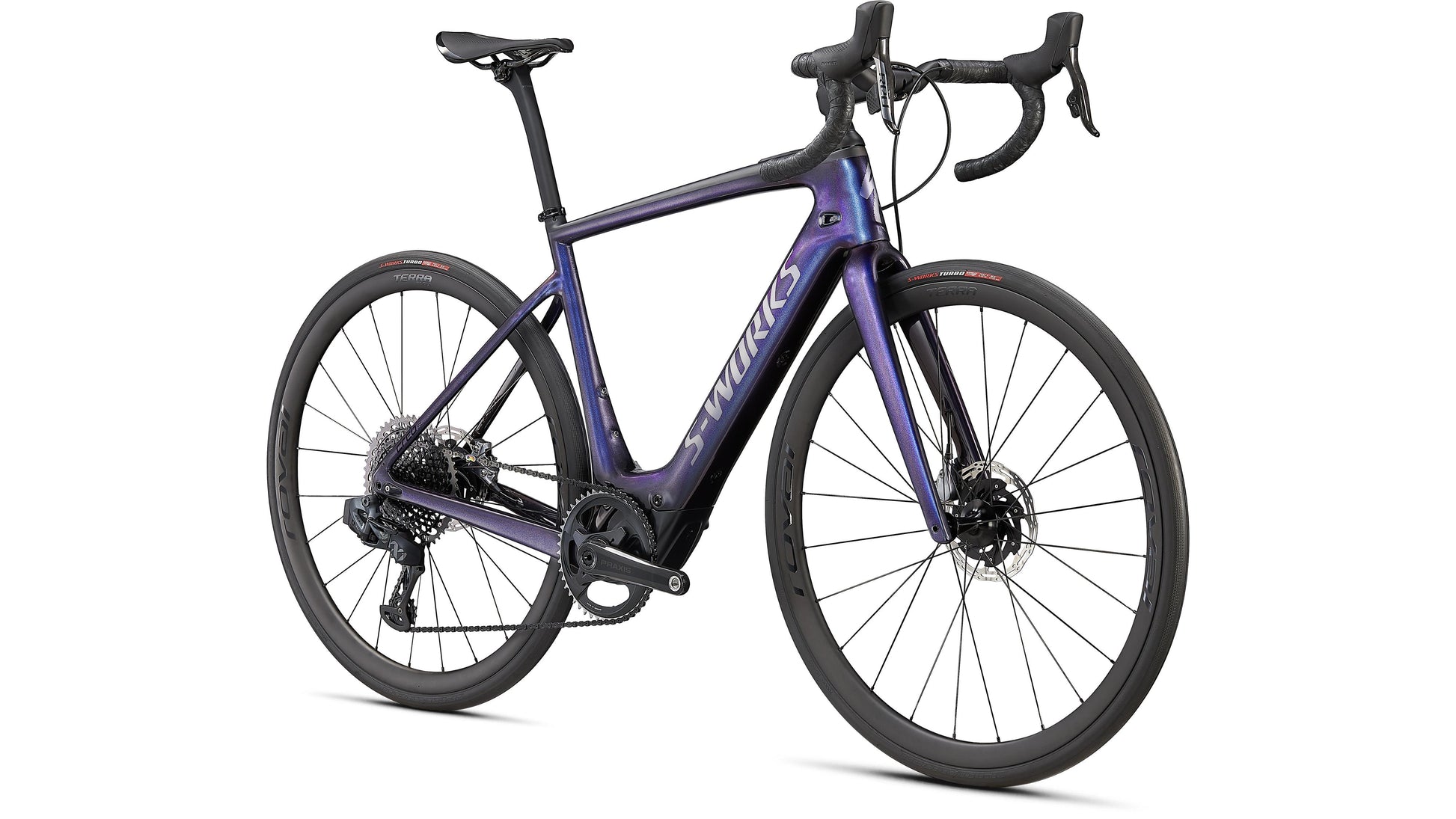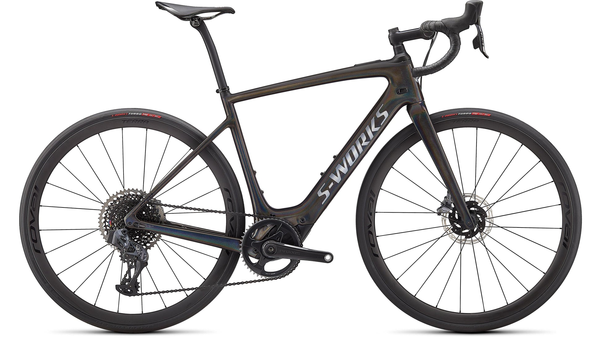 Like all of our S-Works bikes, the S-Works Turbo Creo SL is our pinnacle build. The FACT 11r chassis and Future Shock 2.0 with a hydraulic damper is dressed with a 1x build that includes SRAM Red AXS eTap, a SRAM XX1 Eagle rear derailleur, and a 10-50t cassette for an incredible gear range. It rolls on Roval Terra CLX Disc carbon wheels and 30mm S-Works Turbo tires. And to finish off the build, we've included our S-Works Carbon Hover bars, an S-Works Future Stem, and a Body Geometry S-Works Power saddle. We're throwing in a range extender too, because you're never going to want to stop riding this bike.