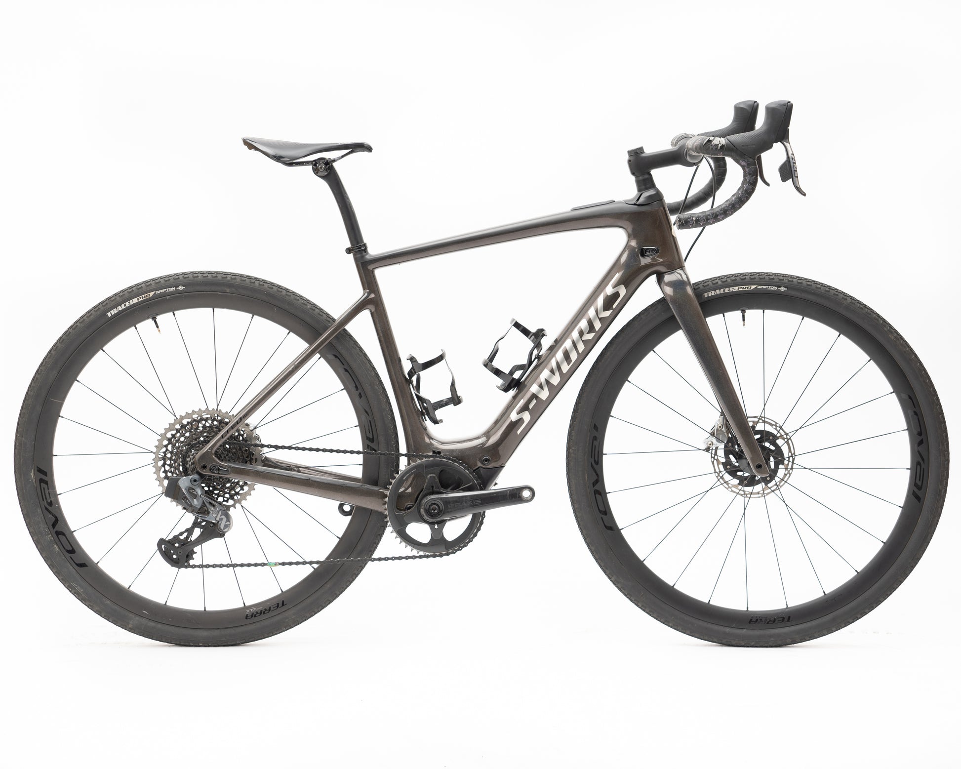 Like all of our S-Works bikes, the S-Works Turbo Creo SL is our pinnacle build. The FACT 11r chassis and Future Shock 2.0 with a hydraulic damper is dressed with a 1x build that includes SRAM Red AXS eTap, a SRAM XX1 Eagle rear derailleur, and a 10-50t cassette for an incredible gear range. It rolls on Roval Terra CLX Disc carbon wheels and 30mm S-Works Turbo tires. And to finish off the build, we've included our S-Works Carbon Hover bars, an S-Works Future Stem, and a Body Geometry S-Works Power saddle. We're throwing in a range extender too, because you're never going to want to stop riding this bike.