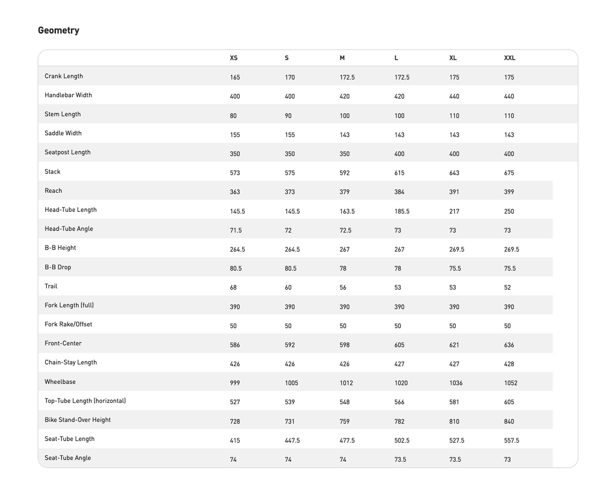 | Head-Tube Length | 145.5 mm | 145.5 mm | 163.5 mm | 185.5 mm | 217 mm | 250 mm |