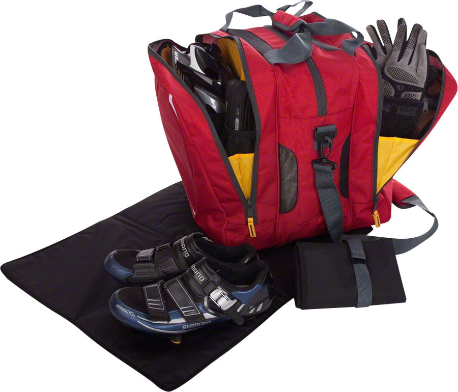 The Bike Cube Deluxe features a roll-up tool organizer, padded changing mat, a second padded eye-ware pocket, divided center compartment and detachable shoulder strap.- The Bike Cube Deluxe features a roll-up tool organizer, padded changing mat, a second padded eye-ware pocket, divided center compartment and detachable shoulder strap.