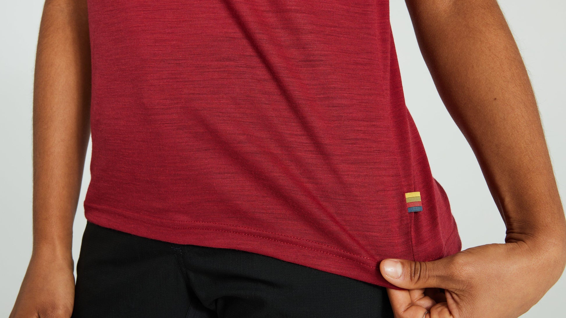 A light t-shirt in Merino wool and recycled polyester. Combines the temperature-regulating properties of wool with the durability and moisture-wicking properties of polyester. Features a Hi-Low hem that's slightly longer in the back and a zippered back pocket on the right-hand side for your keys, cash, or credit card. Slightly longer sleeves provide extra protection from the sun. Regular fit. Part of the Specialized/Fjällräven Exchange series for urban rides and bikepacking adventures.
