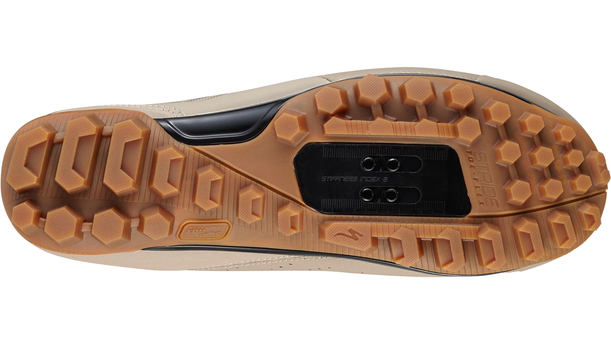 - Injection STRIDE toe-flex technology allows for natural toe movement off-bike but remains stiff for pedaling: Stiffness index 6.0