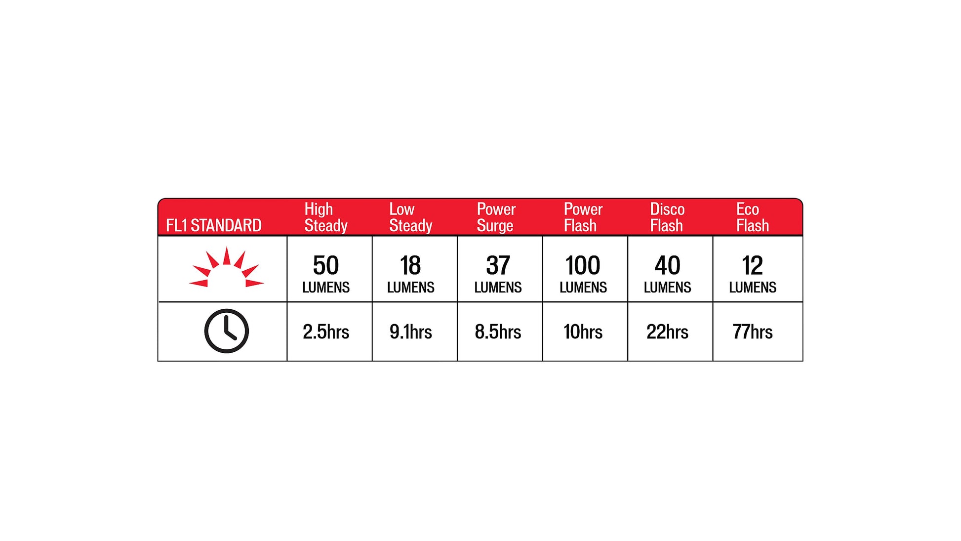 - Steady High mode: 50 lumens for 2:30 hours