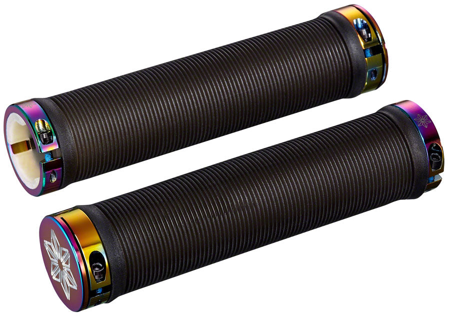 Supacaz RAD grips feature a ribbed pattern for comfort and locking clamps to secure the grips to the bars.- Supacaz RAD grips feature a ribbed pattern for comfort and locking clamps to secure the grips to the bars.