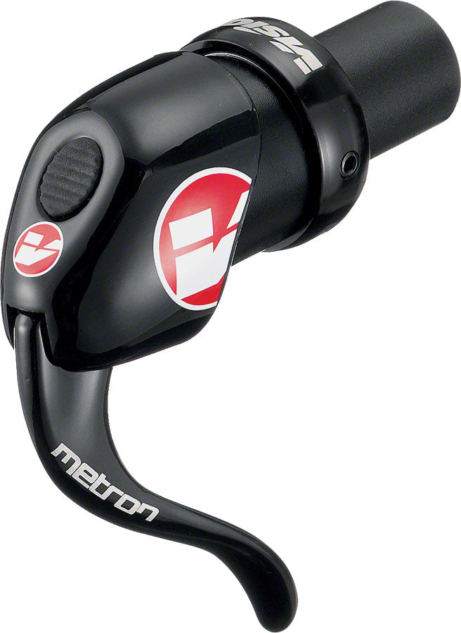 The Metron uses a TT-brake-style lever to pull in cable, downshifting the rear derailleur or upshifting the front. To release cable, the entire head of the shifter is pushed backwards with the thumb with an easy click.- The Metron uses a TT-brake-style lever to pull in cable, downshifting the rear derailleur or upshifting the front. To release cable, the entire head of the shifter is pushed backwards with the thumb with an easy click.