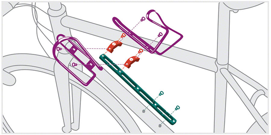 B-RAD, which stands for Bottle Relocation and Accessory Device, is a system for organizing on-bike accessory storage using bottle cage mounts. Used alone to shift bottle cage location for clearance, or combine with other B-RAD accessories to carry tools, tubes pumps or a 2nd bottle on downtubes.